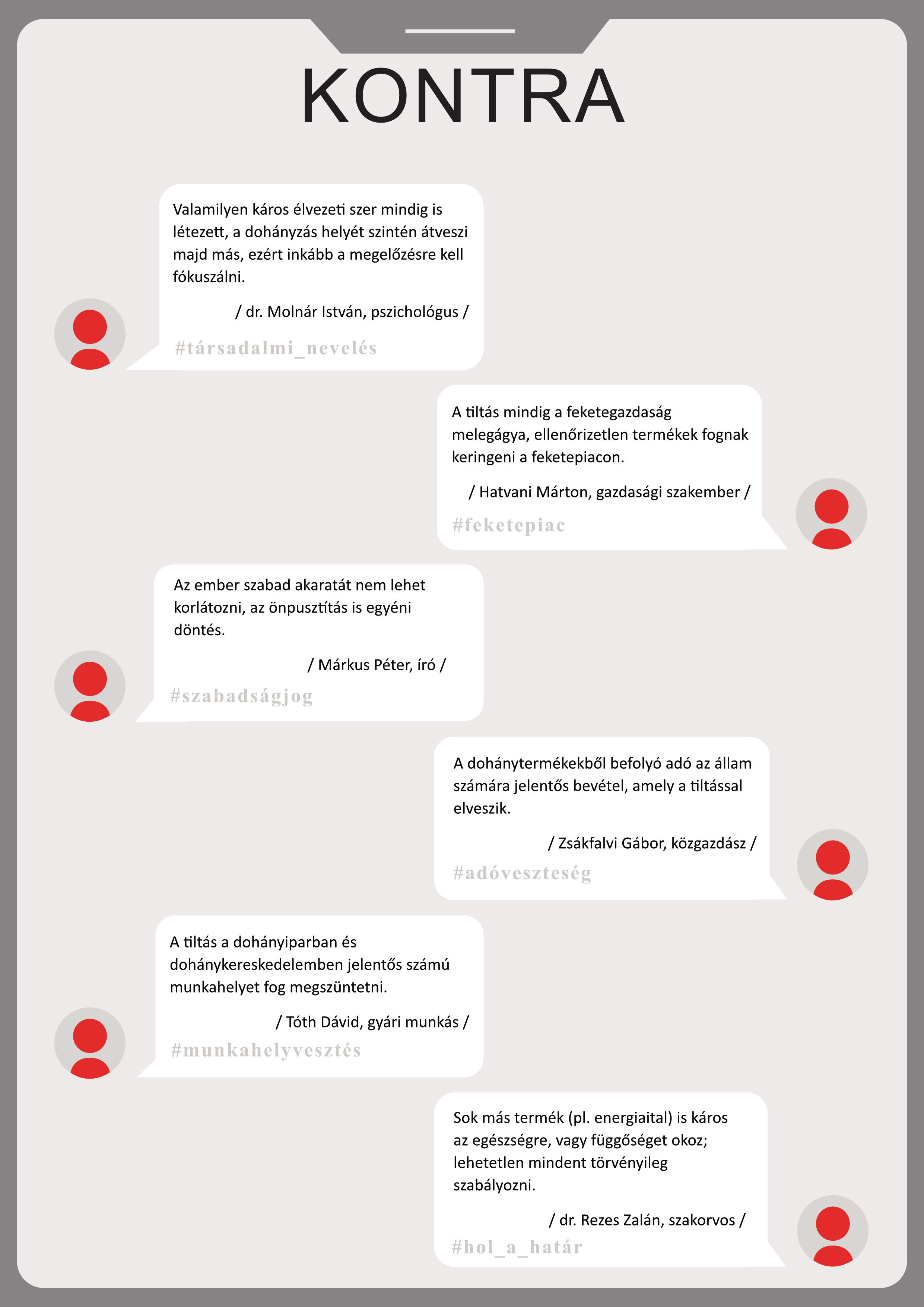 Pro és kontra érveket tartalmazó tablók A tablók az álláspontok kialakításában nyújtanak segítséget: a mellett és az ellen sorakoztatnak fel érveket, hogy be kellene-e tiltani a dohányzást. Letöltésükhöz kattintson a képekre! |