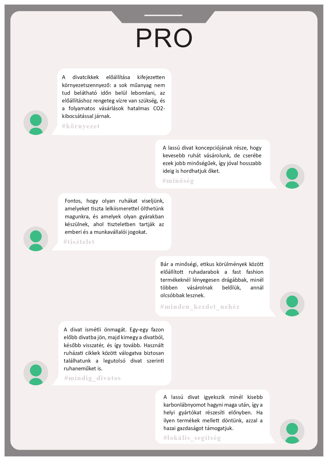 Pro és kontra érveket tartalmazó tablók A tablók az álláspontok kialakításában nyújtanak segítséget: a mellett és az ellen sorakoztatnak fel érveket, hogy szükséges-e változtatni a vásárlási szokásainkon vagy sem. Letöltésükhöz kattintson a képekre! |